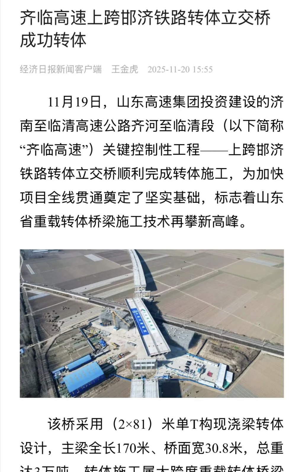 11月19日,山东高速集团投资建设的济南至临清高速公路齐河至临清段(以下简称“齐临高速”)关键控制性工程——上跨邯济铁路转体立交桥顺利完成转体施工,为加快项目全线贯通奠定了坚实基础,标志着山东省重载转体桥梁施工技术再攀新高峰。